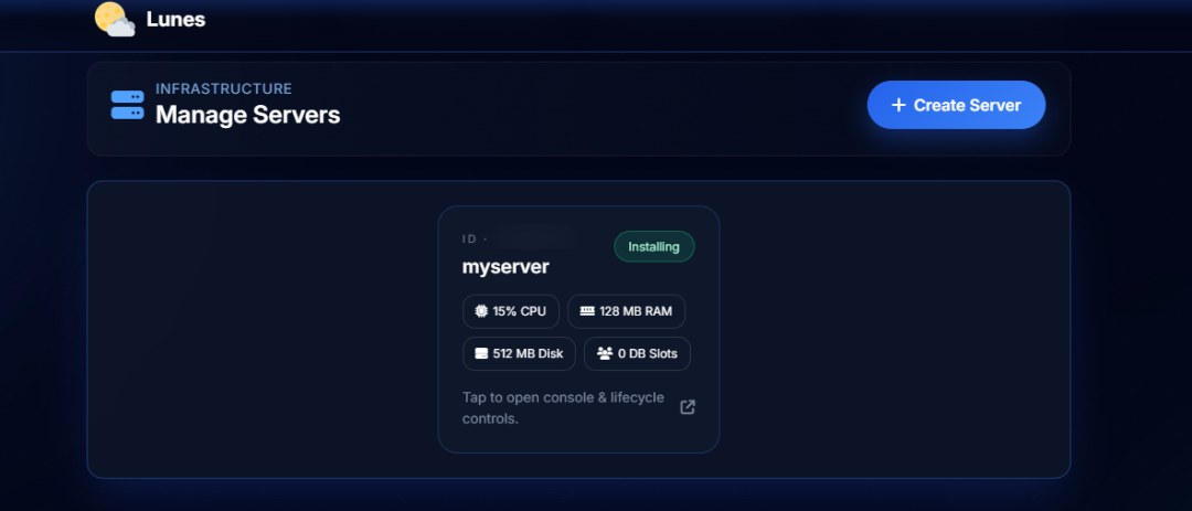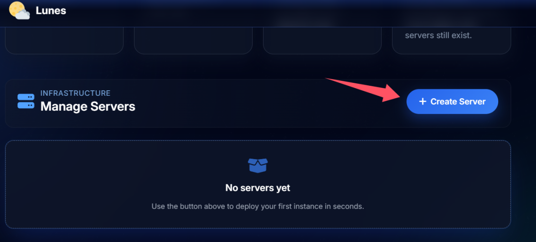 之后页面往下滑,找到”Manage Servers”,点击”Create Server”创建一个服务器。