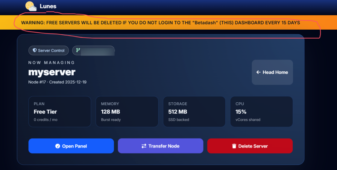 进入之后,页面上方有个橙黄色的注意事项,这个意思就是:你在15天内没有登录这个控制面板,免费的服务器将会被删除。也就是说你要在15天内登录一次这个面板,光登录账号没有用,你还要进入这个服务器的面板。否则机器就会被删除。