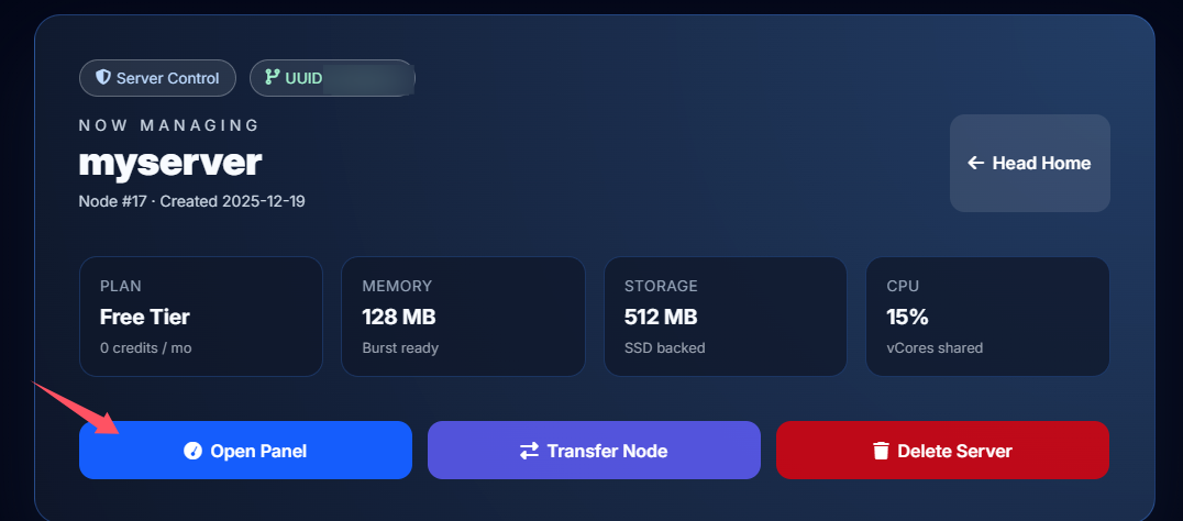 提交完成,创建成功之后,你就能在”Manage Servers”地方看到你刚才创建的机器,点击进去,进入服务器控制面板。