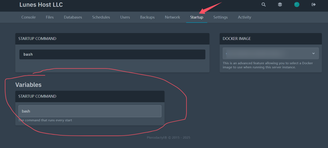 上方菜单栏中找到”Startup”,在”STARTUP COMMAND”中输入: