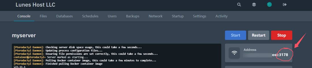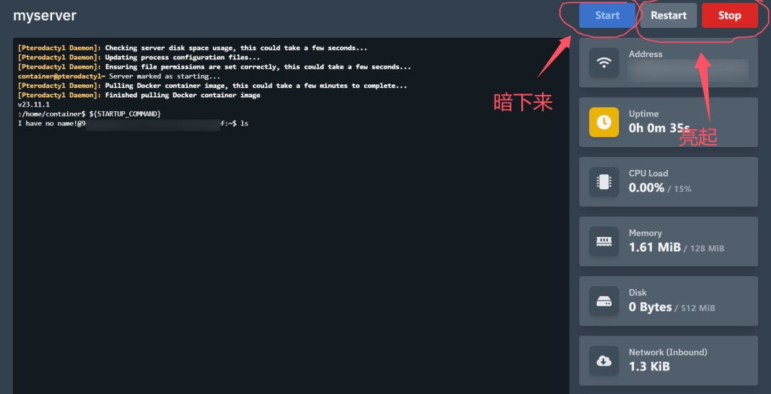 当”Start”暗下来,”Restart”和”Stop”两个按钮亮起,证明启动成功。