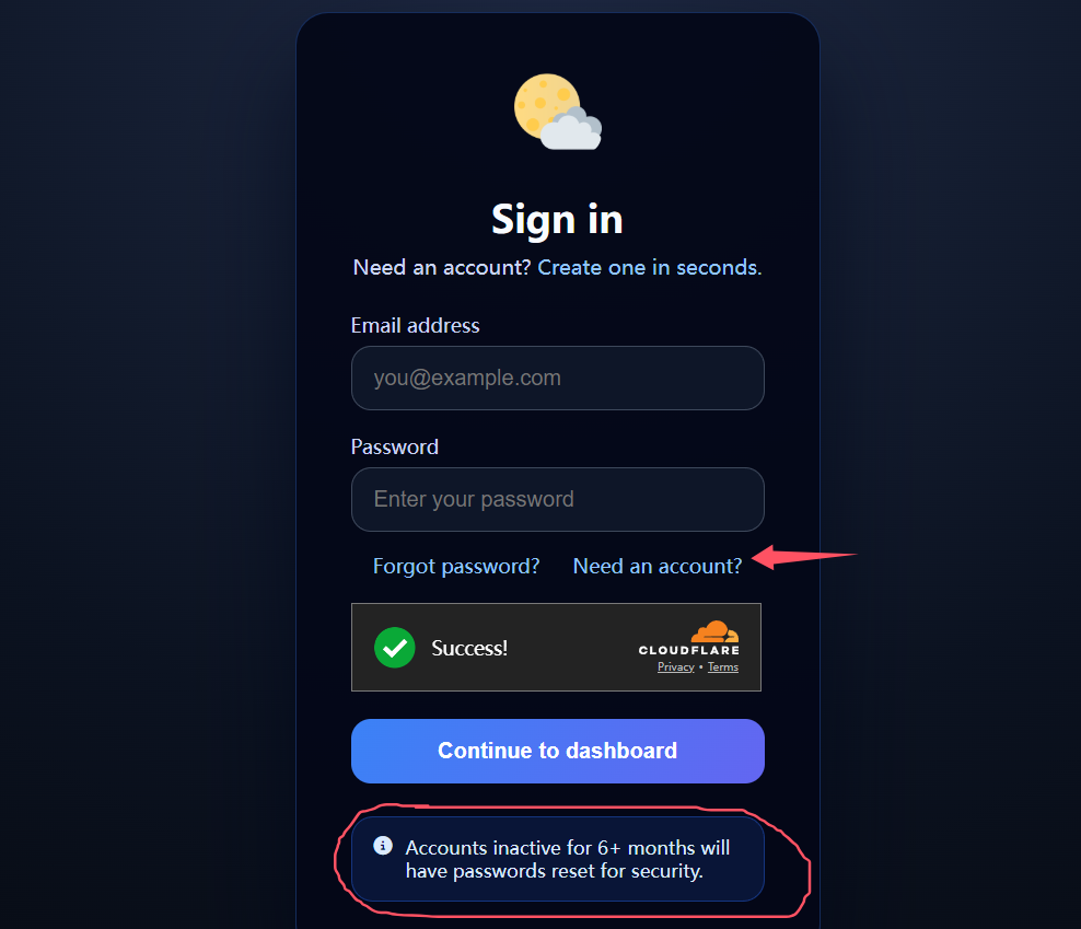 点击”Need an account?”注册一个账户,这里注意一下我用画笔圈出来的提示,上面写道:超过6个月没有使用账户将会把账户的密码重置,所以这里要注意,万一你6个月没有登录使用账户,密码被重置,重置后的密码会不会以邮件的形式发送给你还不一定,到那时估计就只能选择”忘记密码”进行密码的修改了。